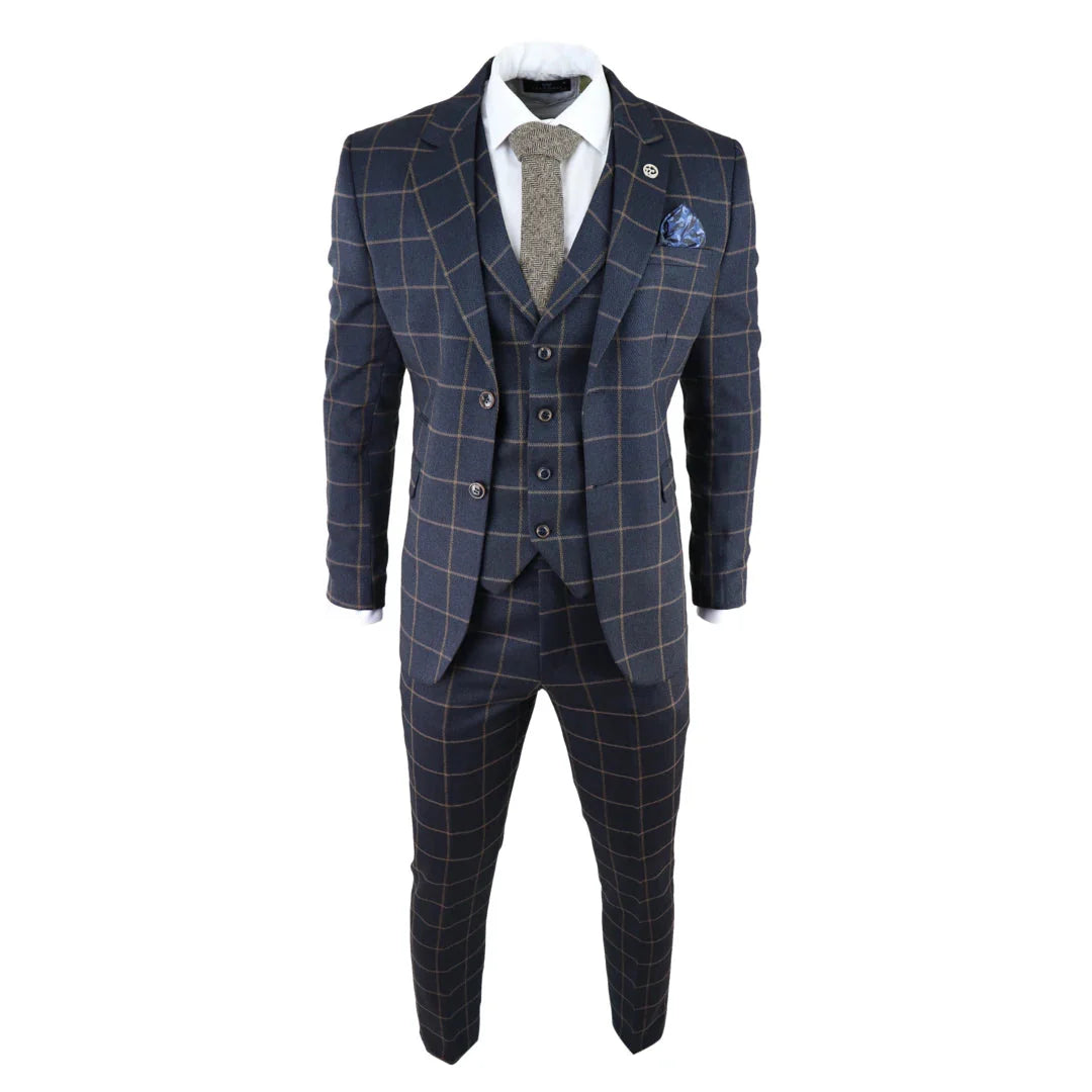 AK-15 - Men's Blue 3 Piece Suit Tan Check Classic Wedding Prom Peaky Tweed