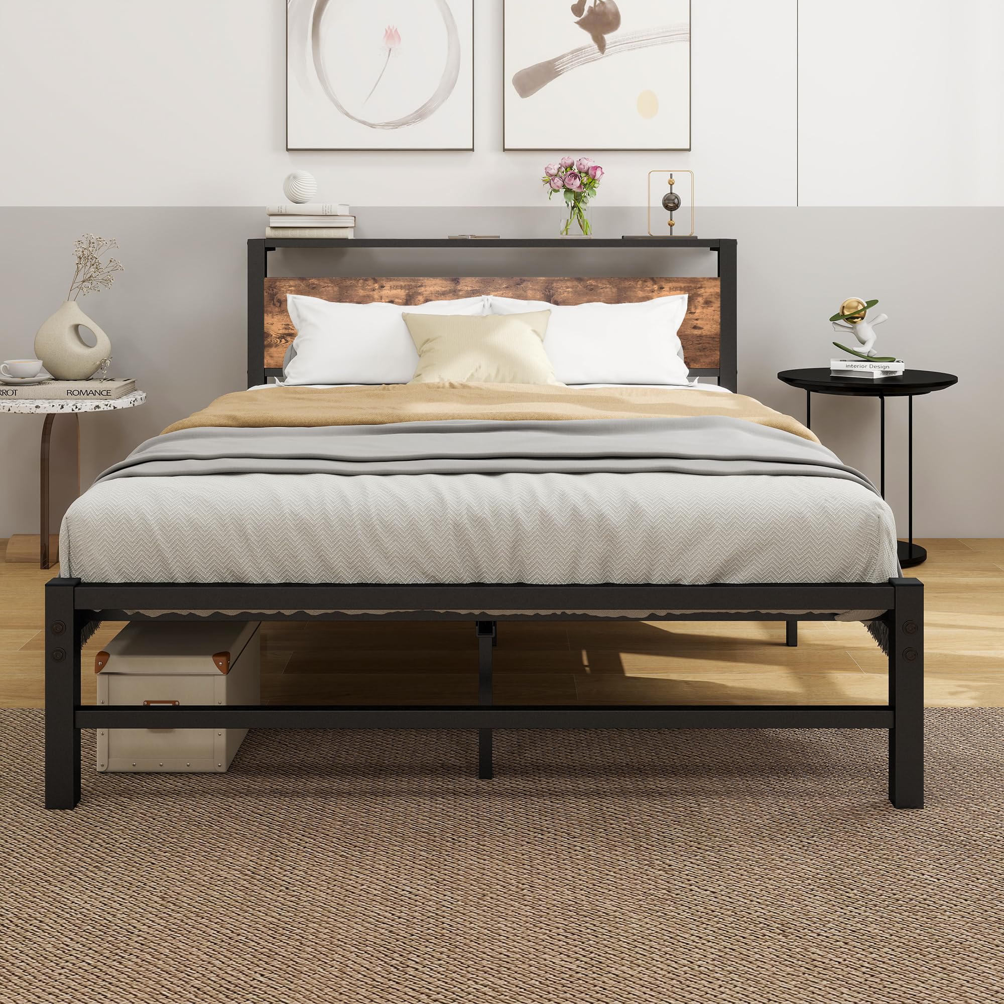 Features Arfarly Metal Bed Frame 140 X 200 Cm With Wooden Headboard, Metal Bed Frame With Slatted Frame, Guest Bed,... Read more