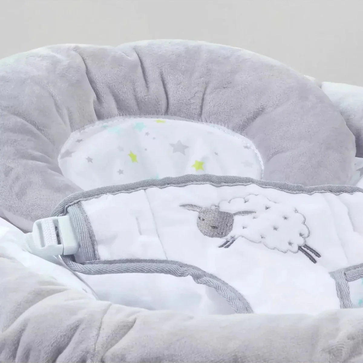 This cosy haven, stitched in velvety-soft fabrics with intricately embroidered dreamscapes, promises hours of delightful bouncing and snoozing. A gentle headrest cradles your newborn's tiny crown, while two cuddly sheep companions whisper lullabies from their perch on the toy bar.