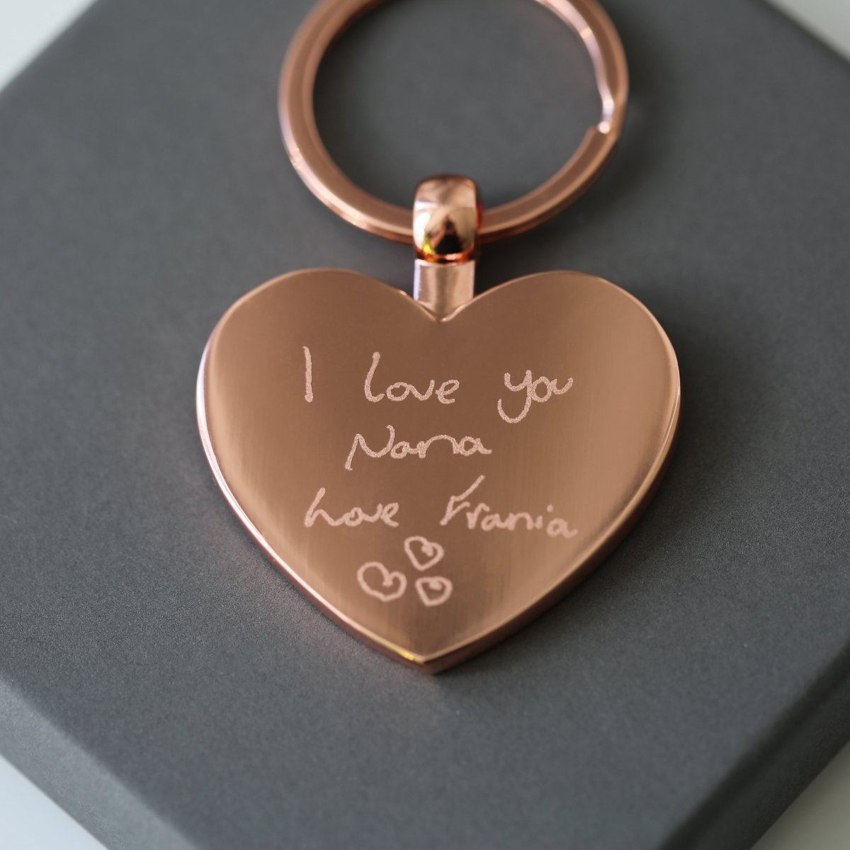 We will perfectly engrave your actual own handwriting on our Hearts Forever keyring. All perfectly presented in a gift box with blue zig-zag shread.