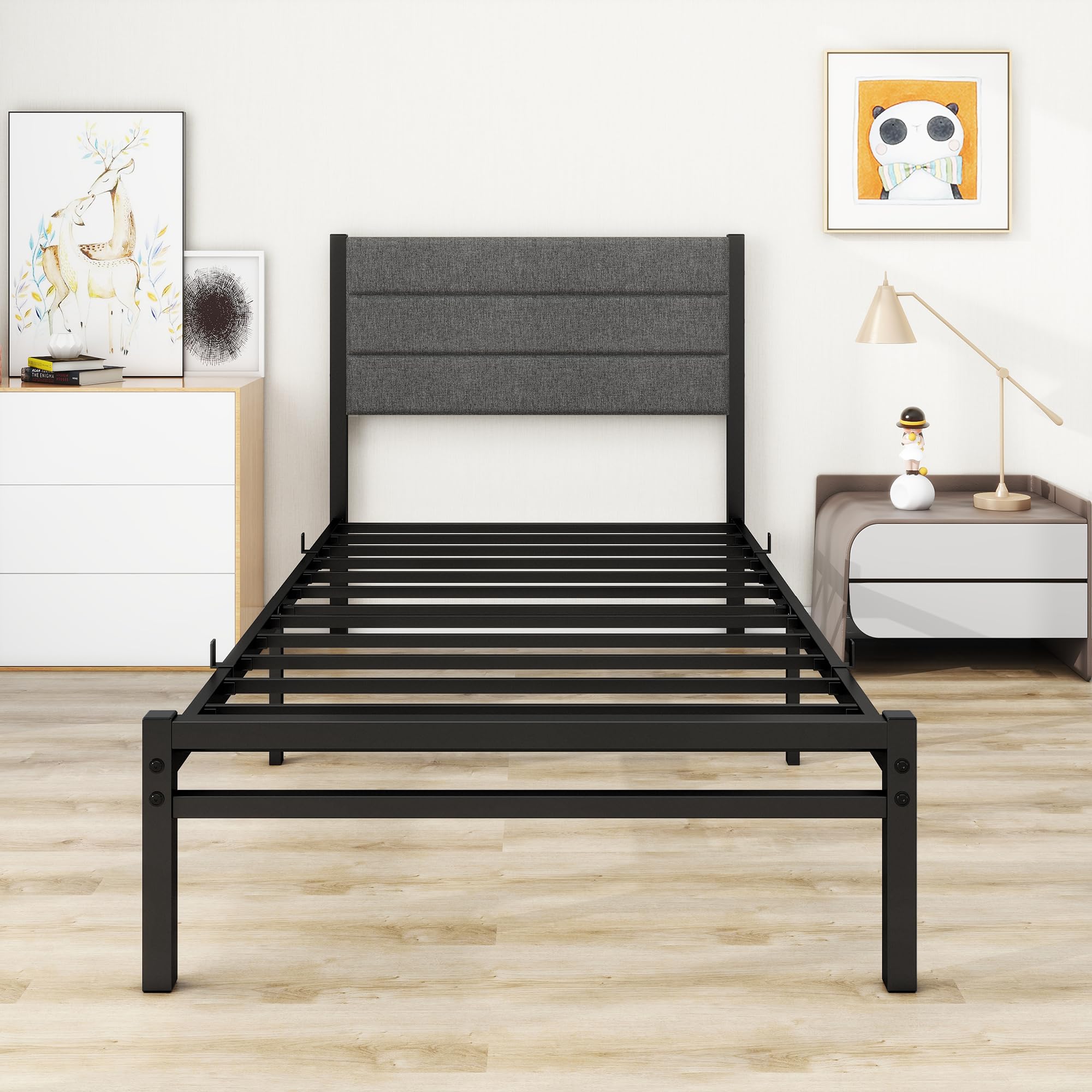 Product description Bed Frame Size: Single Colour: Gray * The single bed frame is made of heavy duty steel frame and high-density foam cushion. Enhanced connecting pipe at the center of side legs for more stability and durability, which helps reduce sagging and extends mattress life, noise free. Anti-slip plastic foot pads protecting floor from scratches. * Modern and minimalist geometric upholstered headboard design, soft and cozy, easy to clean. * Single bed frame with under bed storage offering ample storage space for boxes, bags, shoes, etc. keeping your bedroom organized. * Assembly & Wrranty : Packaged with detailed instruction, labled parts & assembly tools. 12 months warranty, 24h customer service response to give you a 100% satisfactive solution. Package Includes: 1. Single bed frame 2. Upholstered headboard 3. Hardwares and Tools 4. Assembly instruction Safety Warning Always follow the assembly instructions carefully to prevent instability or collapse. Be cautious of sharp edges when handling the bed frame to avoid injury.