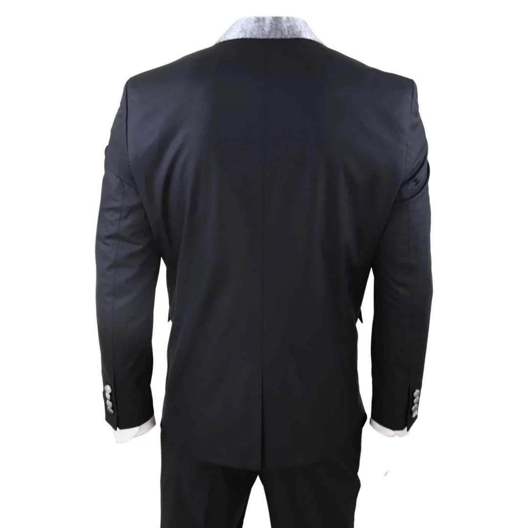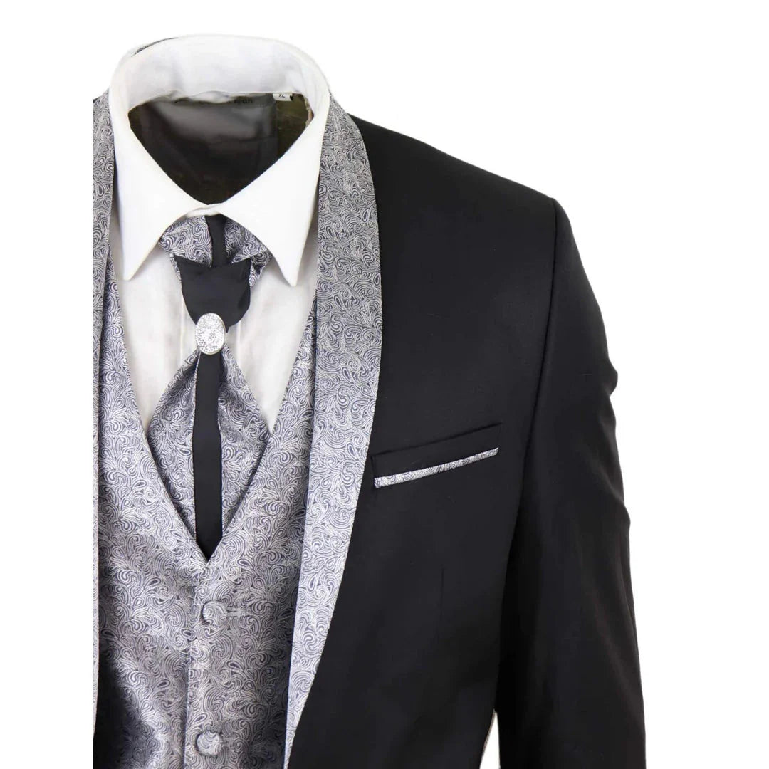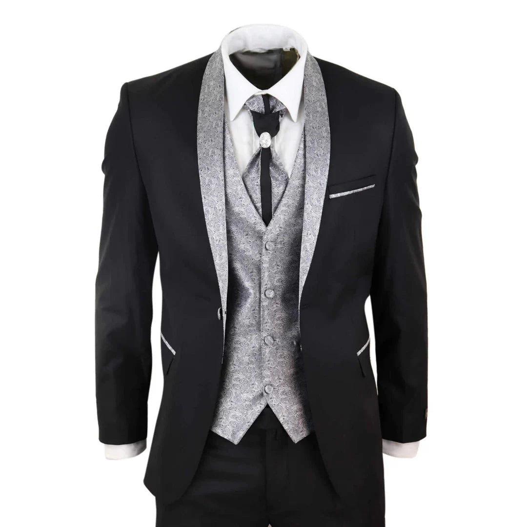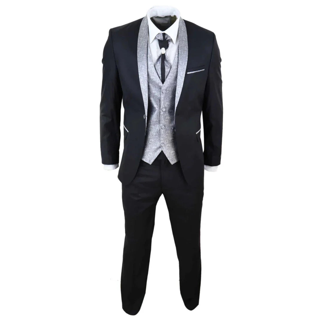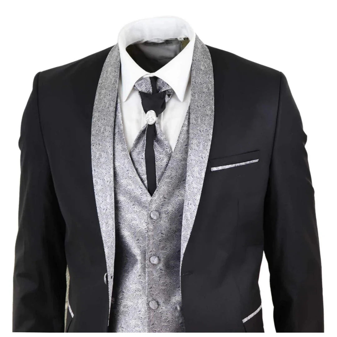 Sal-Yaica - Men's 4 Piece Wedding Suit Groom Shawl Collar Black Silver Cravat
