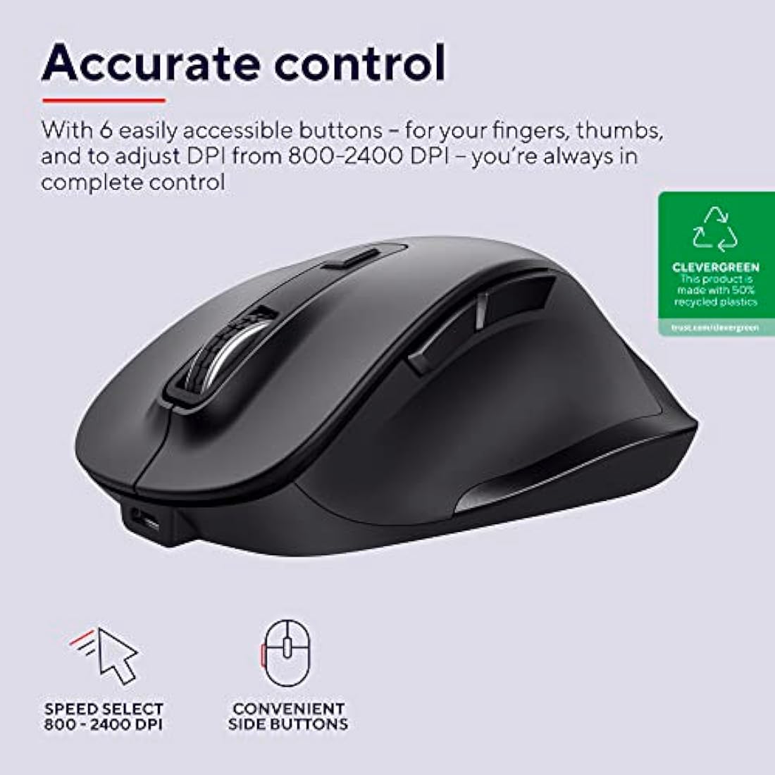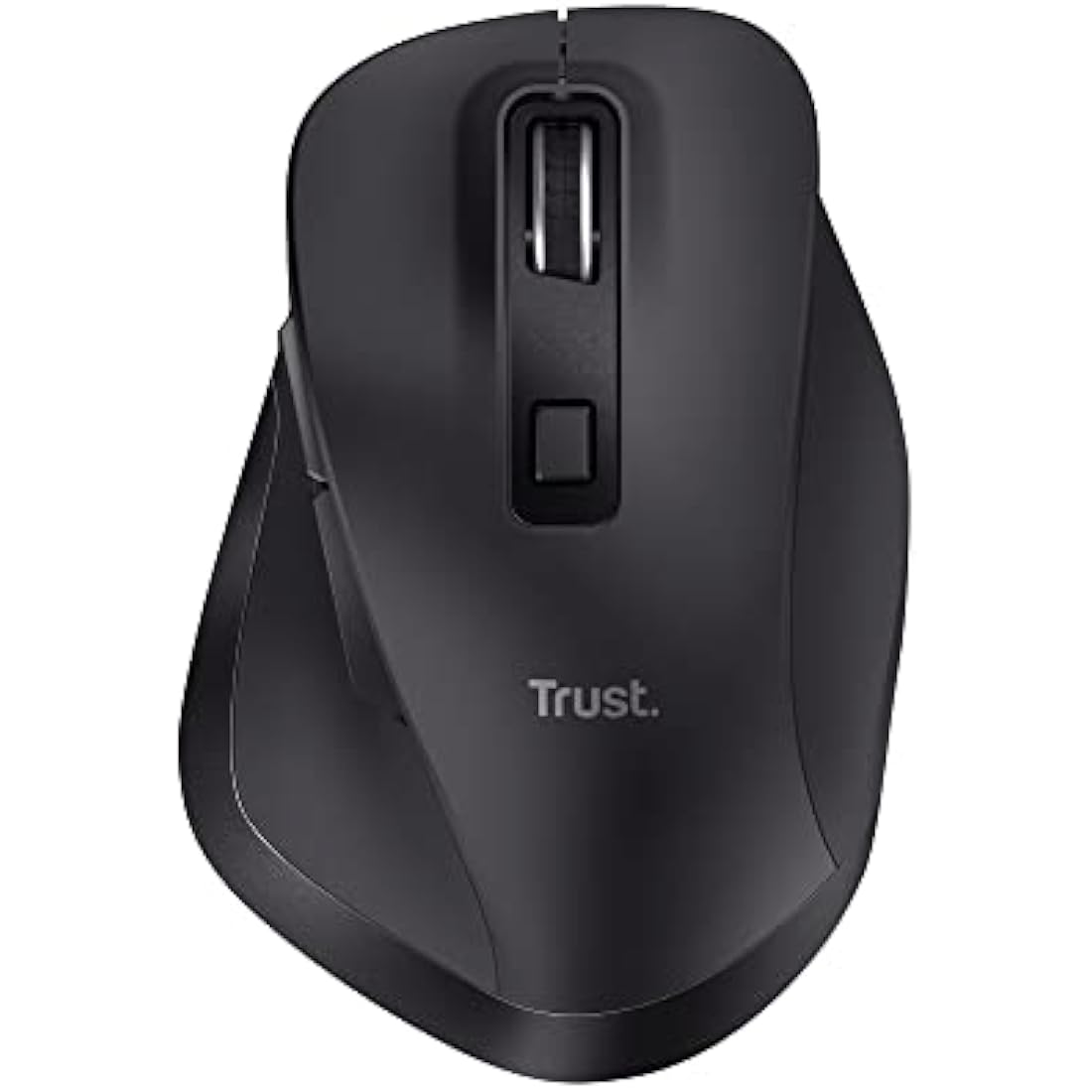 Trust Fyda Rechargeable Wireless Mouse Made With Recycled Materials, 800-2400 DPI, 6 Buttons, Thumb Rest, Comfort Cordless Ergonomic Mouse for Laptop, PC, Mac, Work, Home Office - Black